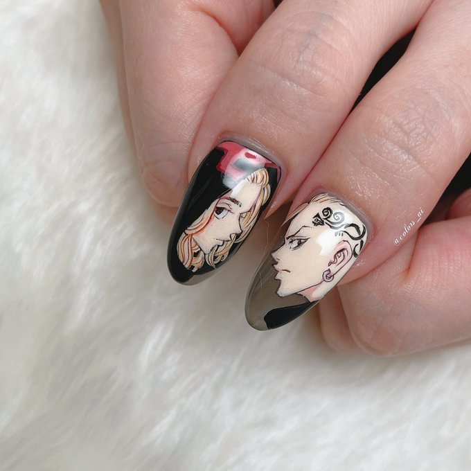 あやたん 久しぶりの東京リベンジャーズネイルです 副総長デザインを理想通りにかっこよく描いて頂きました ネイリストさんも読破してくれて話が盛り上がる盛り上がる なんの打ち合わせも無く偶然総長推しの友人が次の予約入っていたので強制で対の