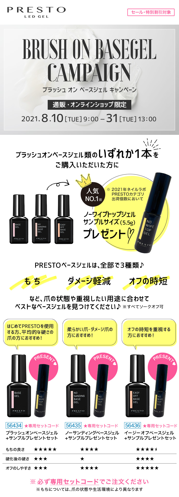 Presto Bambina ノンサンディング ベースジェル 13g UV/LED対応がジェルネイルストアでいつでもお買い得。当日お急ぎ便対象商品は、当日お届け可能です。アマゾン配送商品は、通常配送無料(一部除Presto(プレスト)ベースジェル 8g。柔軟性と硬さのバランスに優れたベースジェル 平均的な硬さの爪におすすめのベースジェル。 硬化後の柔軟性、硬さのバランスが良く、安定した接着性を発揮します。 ※ソークオフ可 ※撹拌不要 ※化粧品製造Presto プレスト クリアジェル 24g 9,000円(税込9,900円);